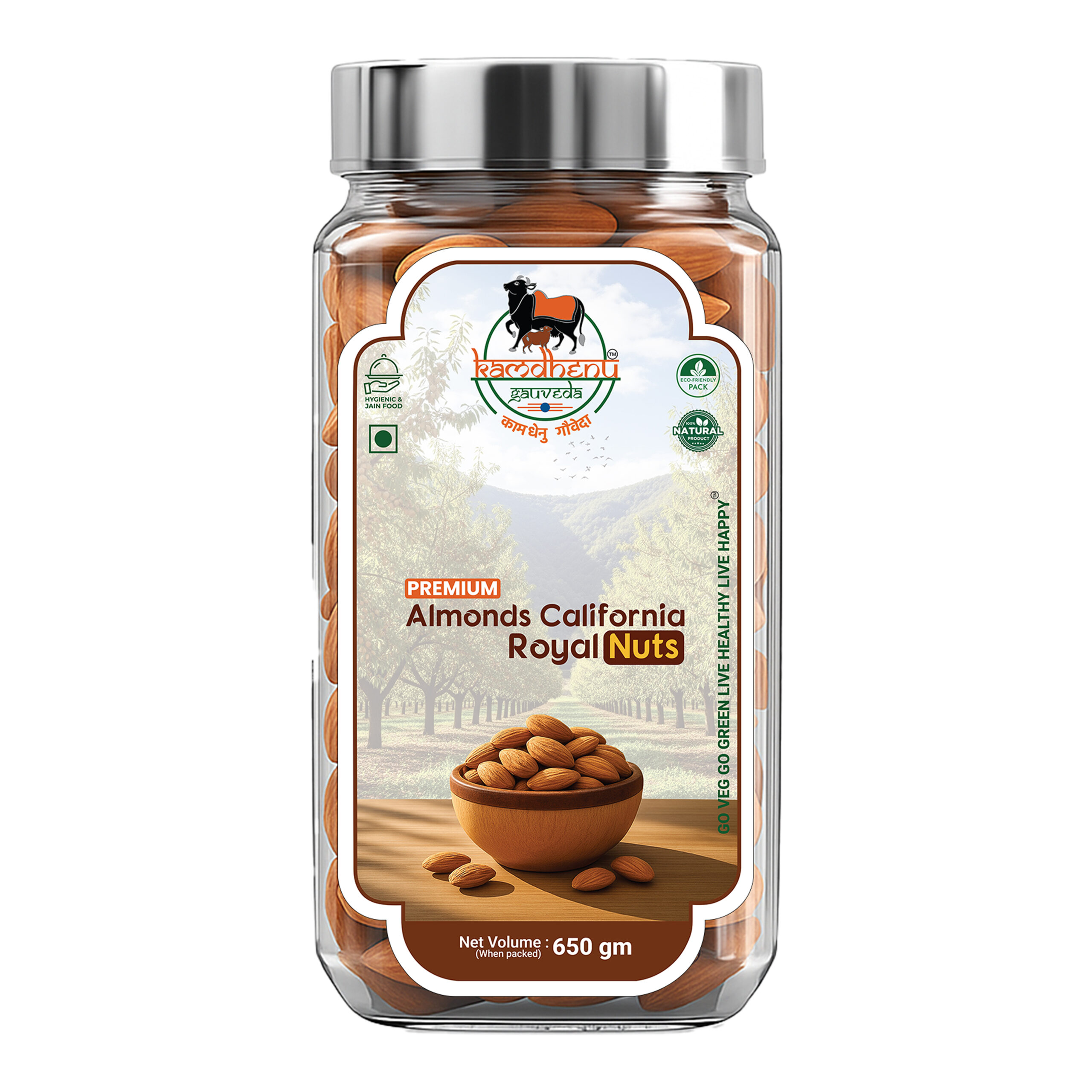 KAMDHENU GAUVEDA Almonds California Royal Nuts are premium-quality almonds selected for their natural shape, rich taste, and balanced nutrition. These almonds are sourced from trusted California growers and carefully processed to maintain their original crunch, aroma, and nutrient profile.