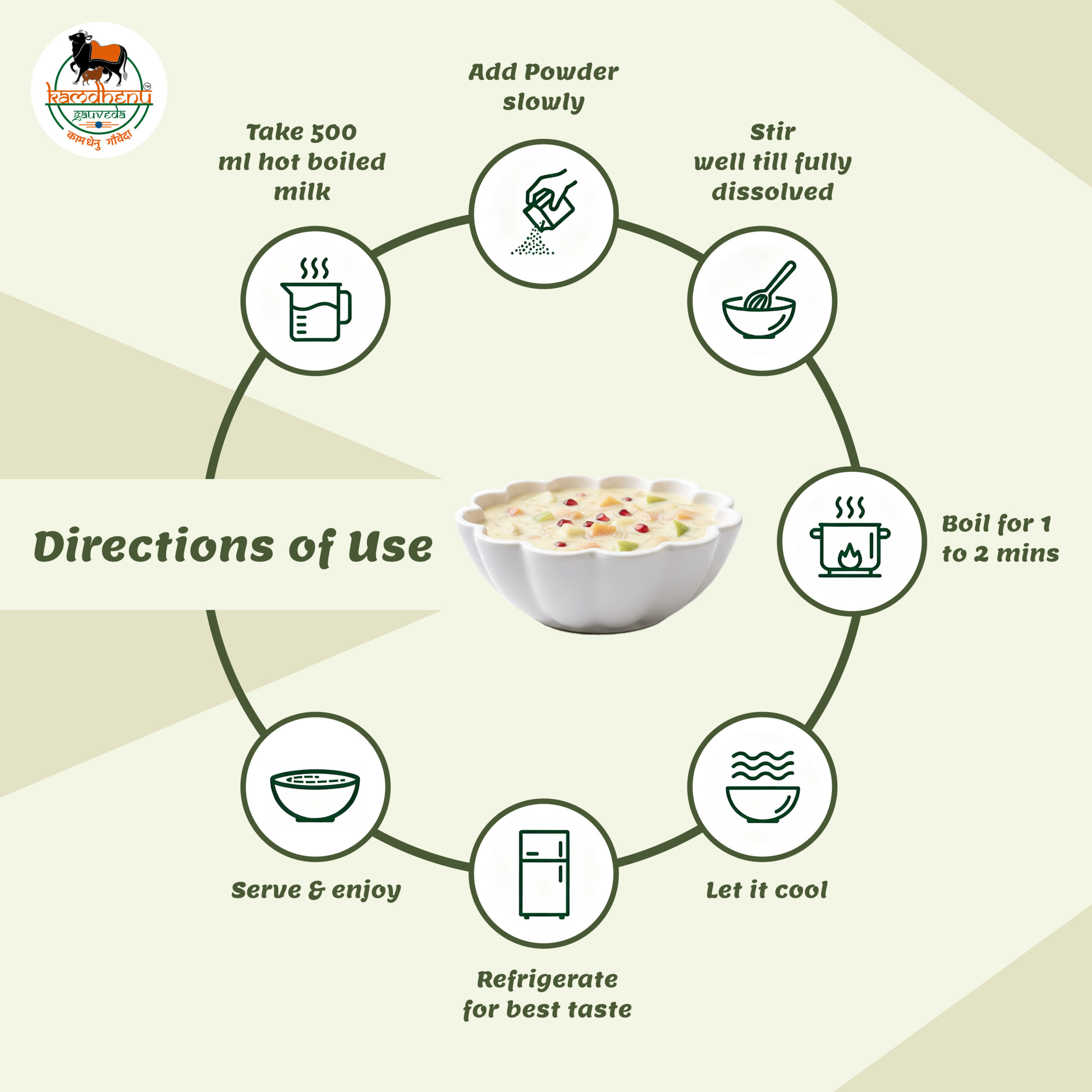 - Mix: Combine 2 tablespoons of Kamdhenu Gauveda Custard Powder with ½ cup of cold milk to make a smooth paste.